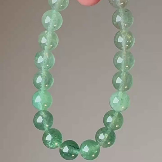 Natural stone characteristics: Colour saturation varies from pale mint to dark forest green. Internal clarity ranges from nearly transparent to slightly cloudy. Some beads show visible zoning (bands of different green intensity). Minor natural inclusions may be present. Your bracelet's specific colour distribution is unique.
